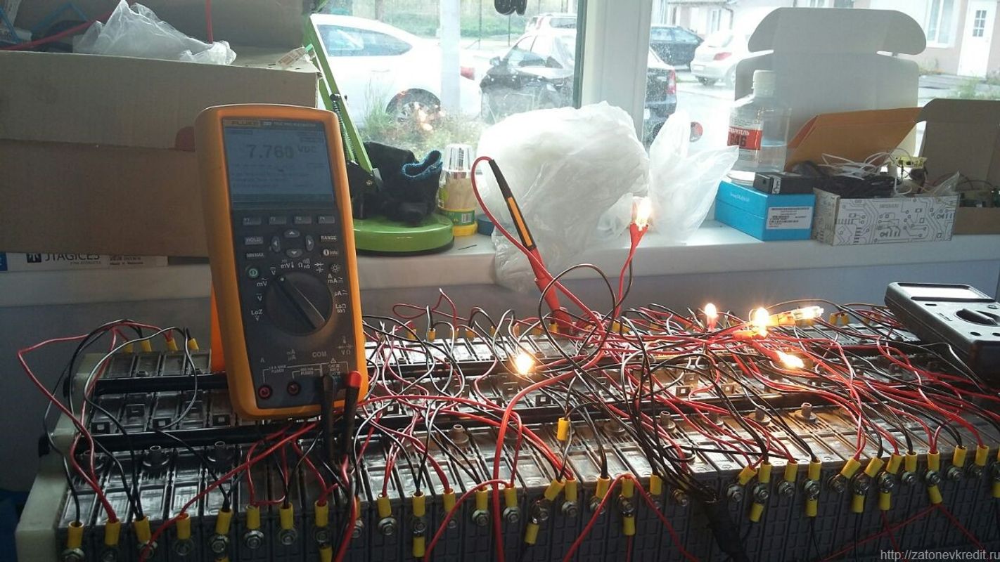 Пластик немного оплавился, удивительно как это все не загорелось конечно. В батарее из-за этого полный дисбаланс, конечно. Нужно было проверить в порядке ли элементы в 11м блоке, так как они могли порядочно нагреться. Сняв снова все эти мостики, я начала балансировать элементы, чтоб потом по динамике разряда каждого подозрительного узнать все ли ок. зарядив опять все ячейки до примерно одинакового значения, нужно было соединить снова все плюсы и минусы параллельно. Для этого был наколхожен провод с клеммами. На вид ничего, но такой способ соединения контактов ошибочен.